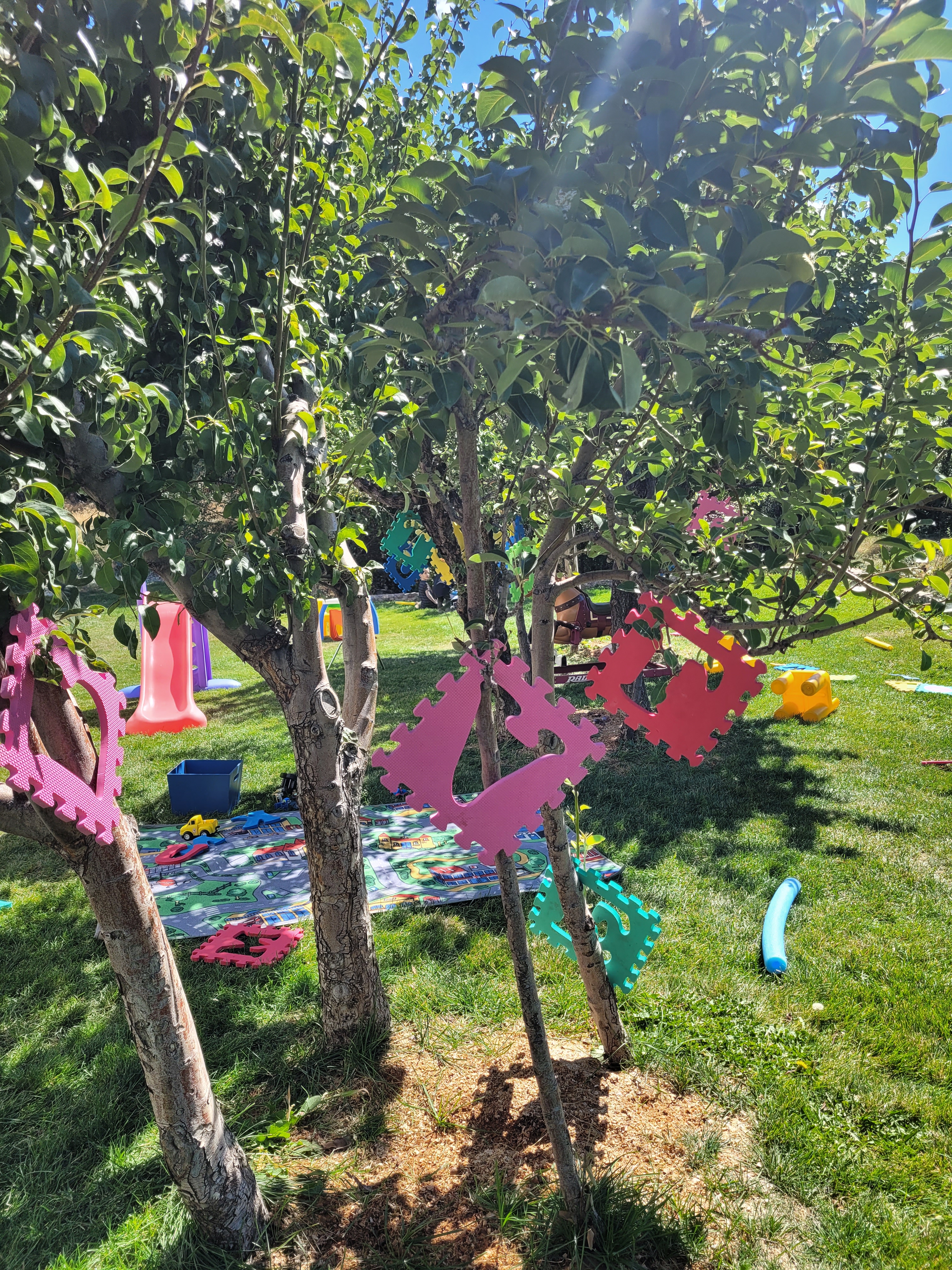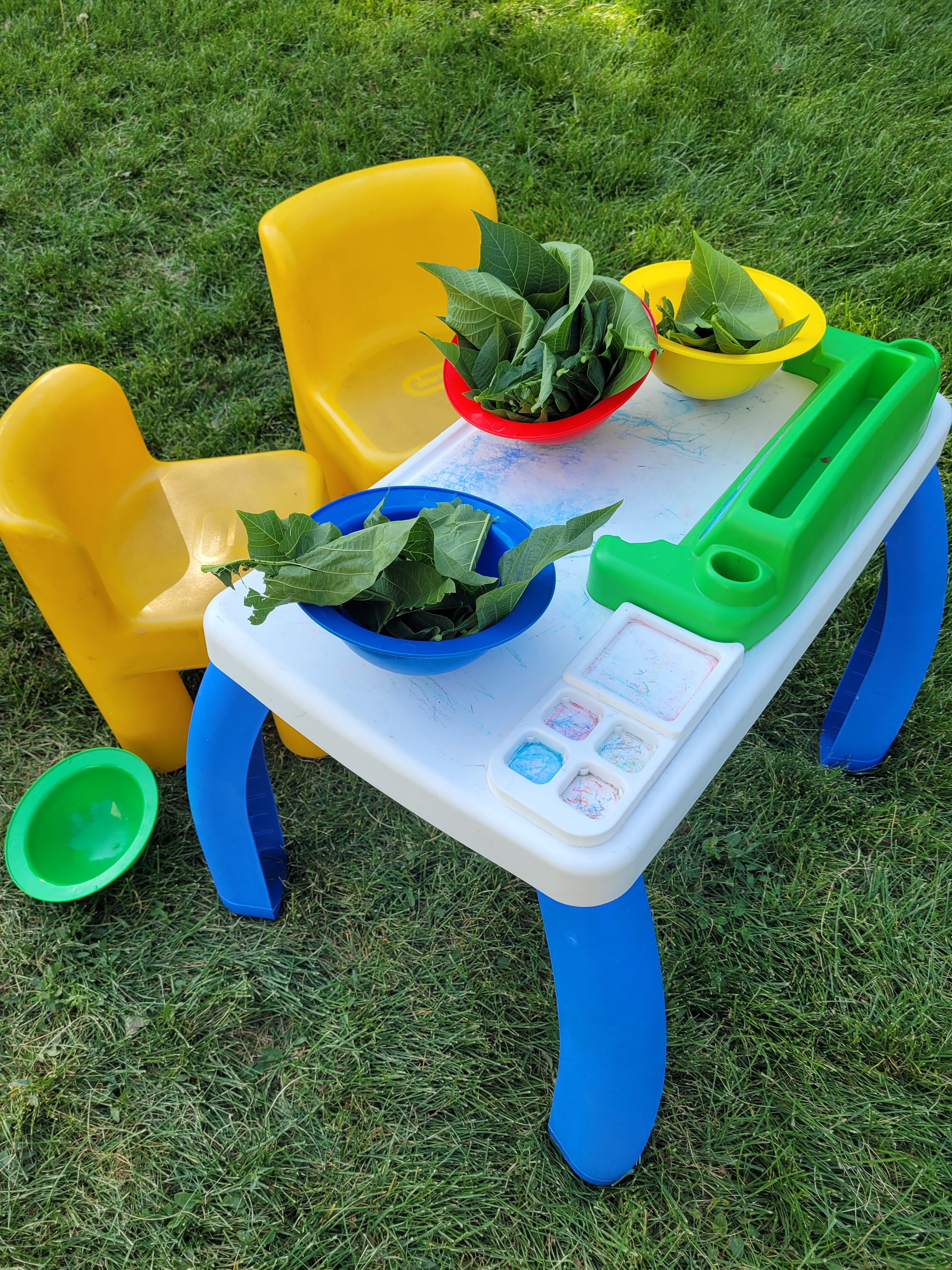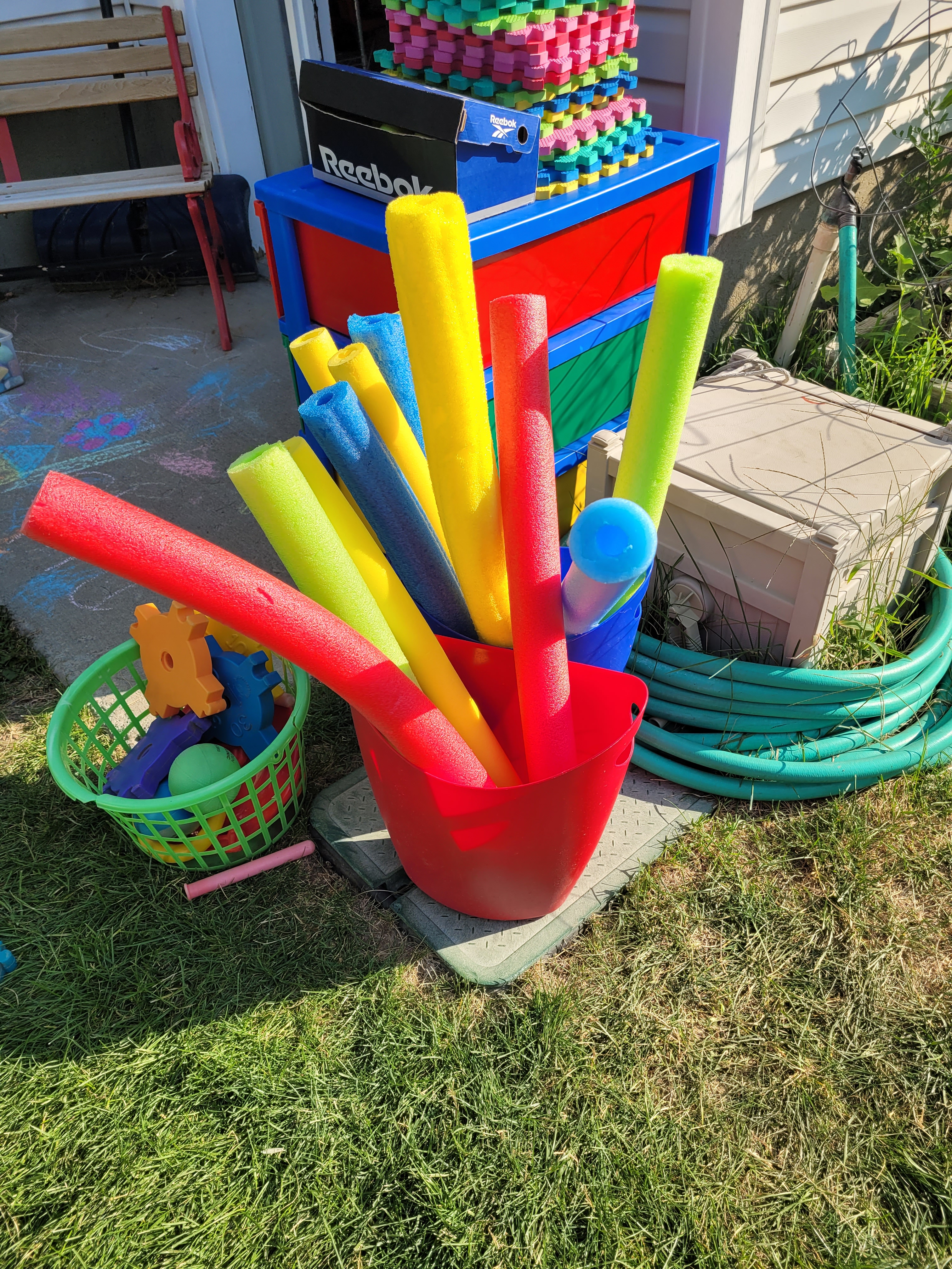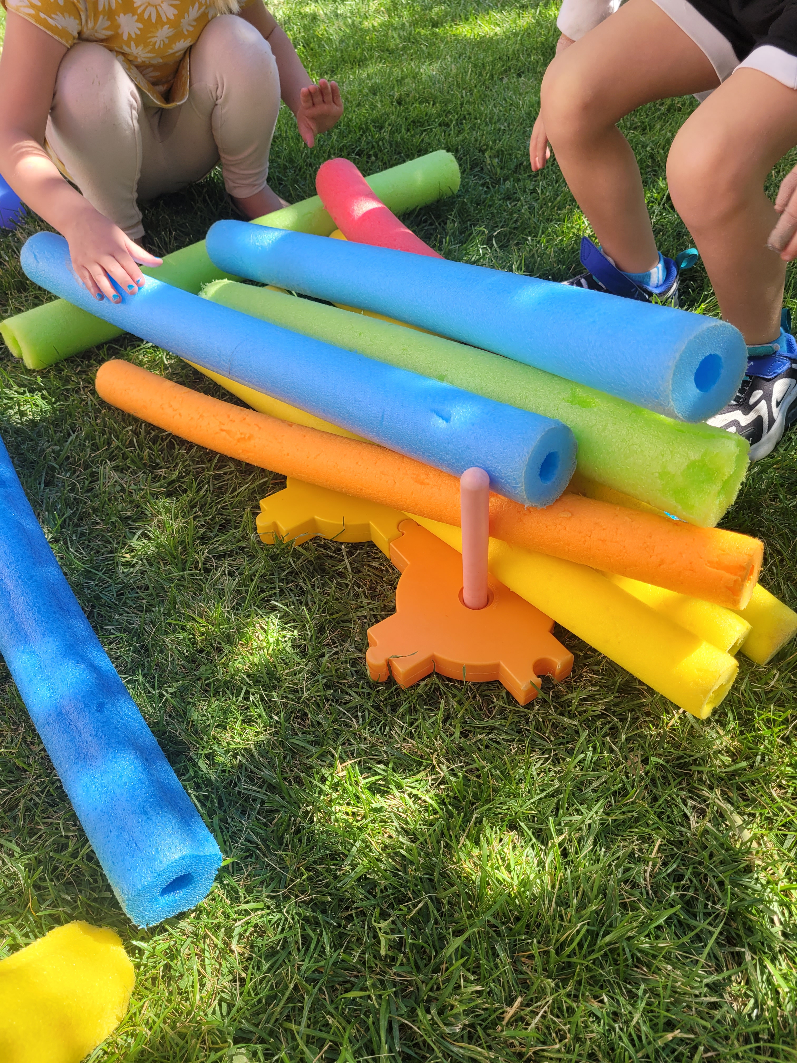 The fist things are these cut up pool noodles I’ve had for years. My intent was to let the children use them as swords since they are safer then sticks. But for some reason, I never got around to setting them out. And by some reason, I mean that I couldn’t bring myself to allow that kind of play, so they sat in my closet until now. Of course the majority of the use is fighting, but there are a few things that surprised me. They were used to make a campfire. They were used to measure the slide. I can’t wait to see what other ideas will come.