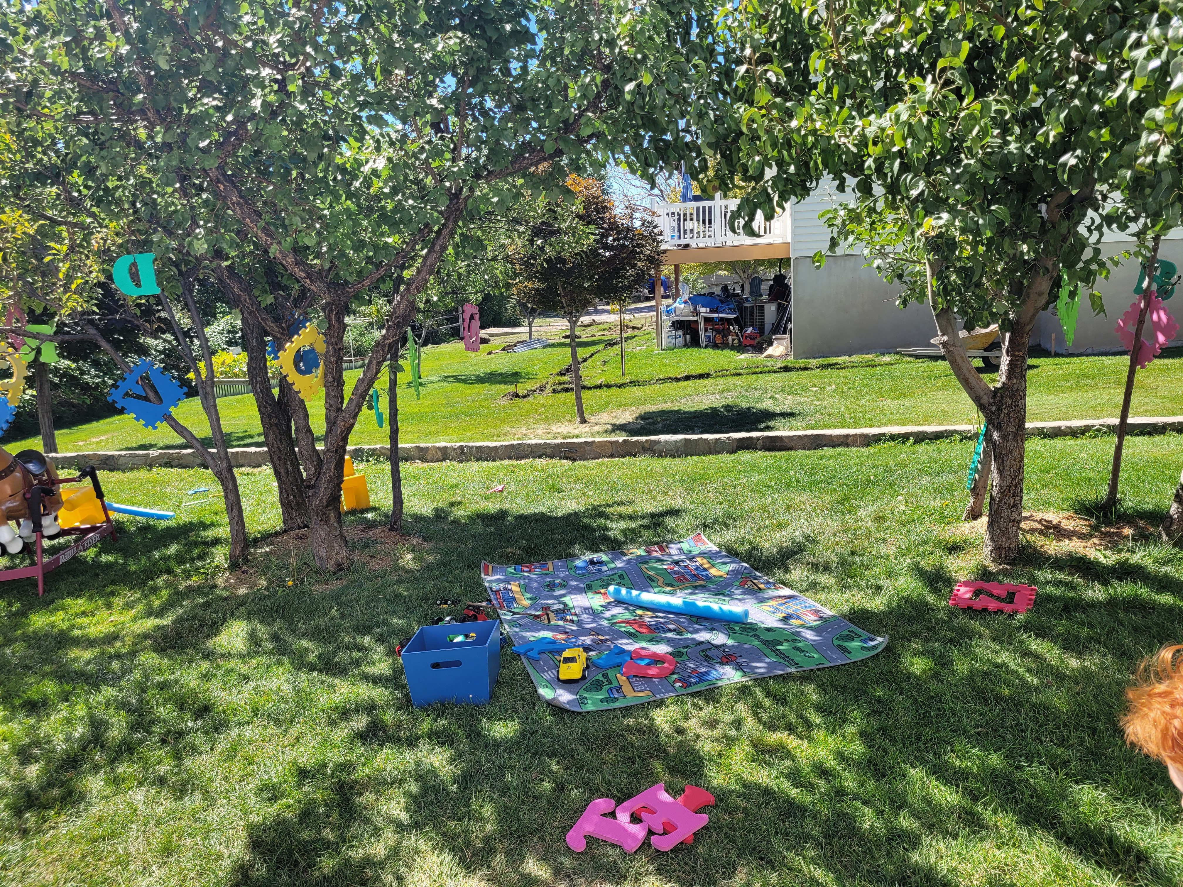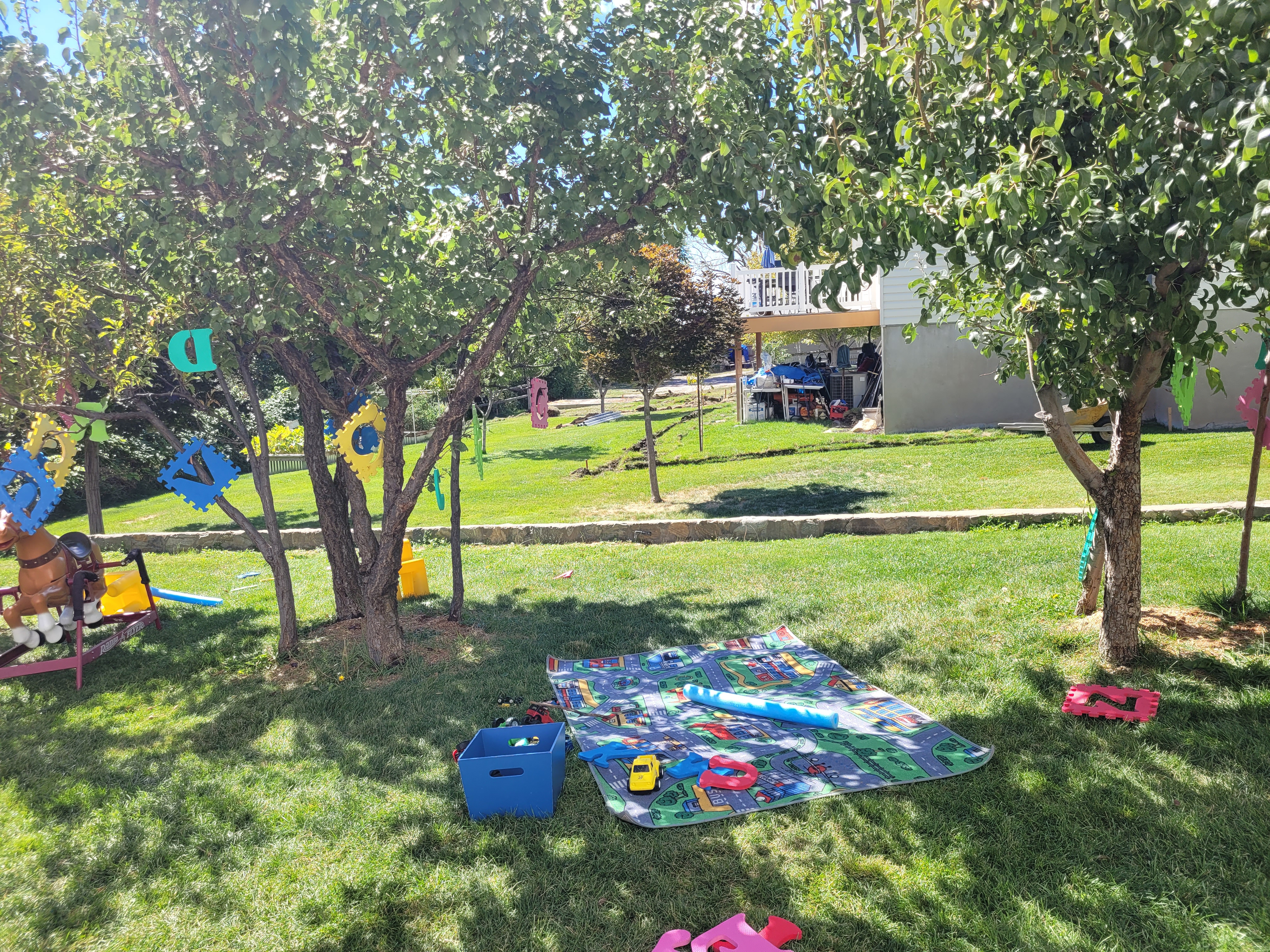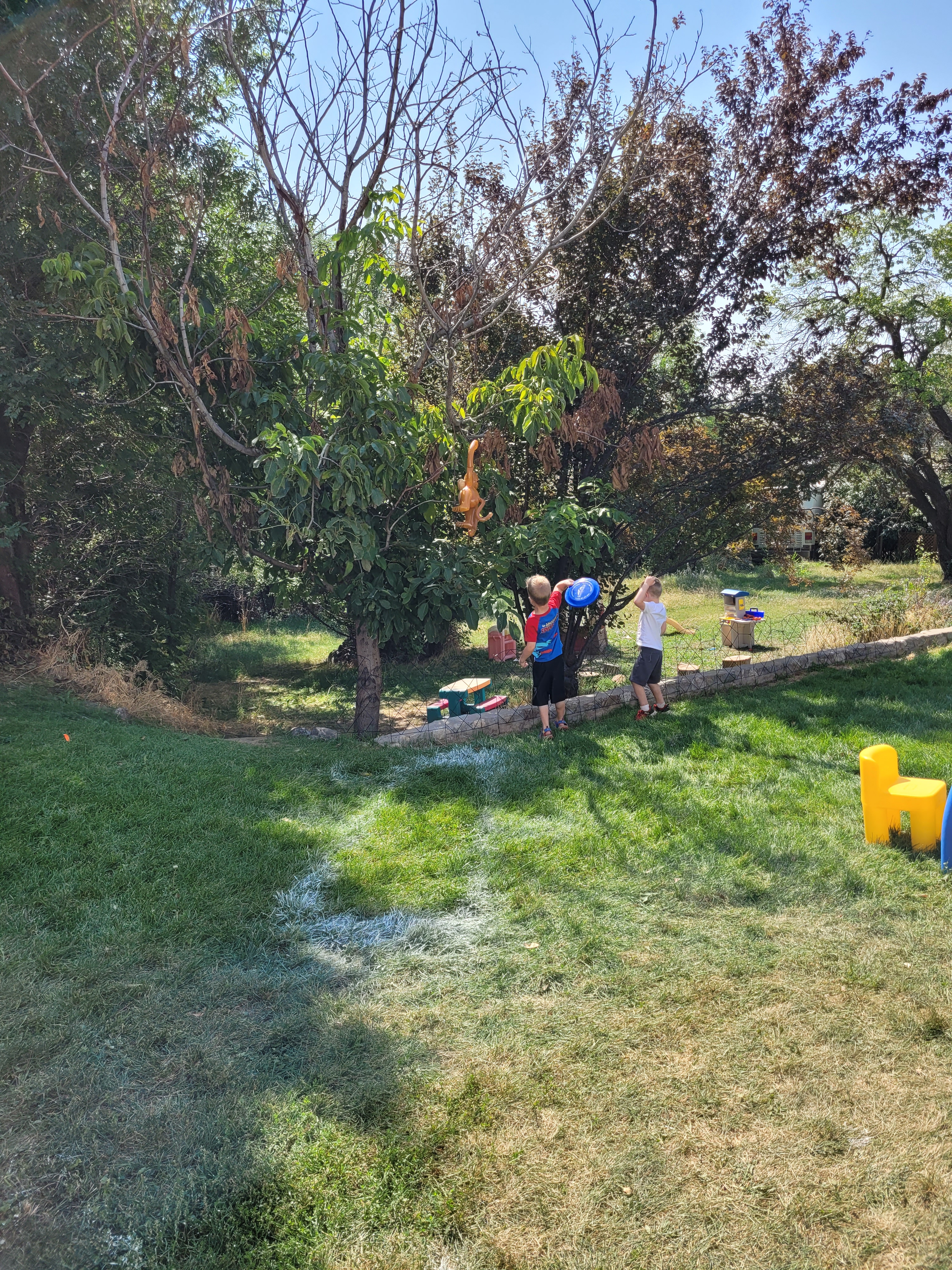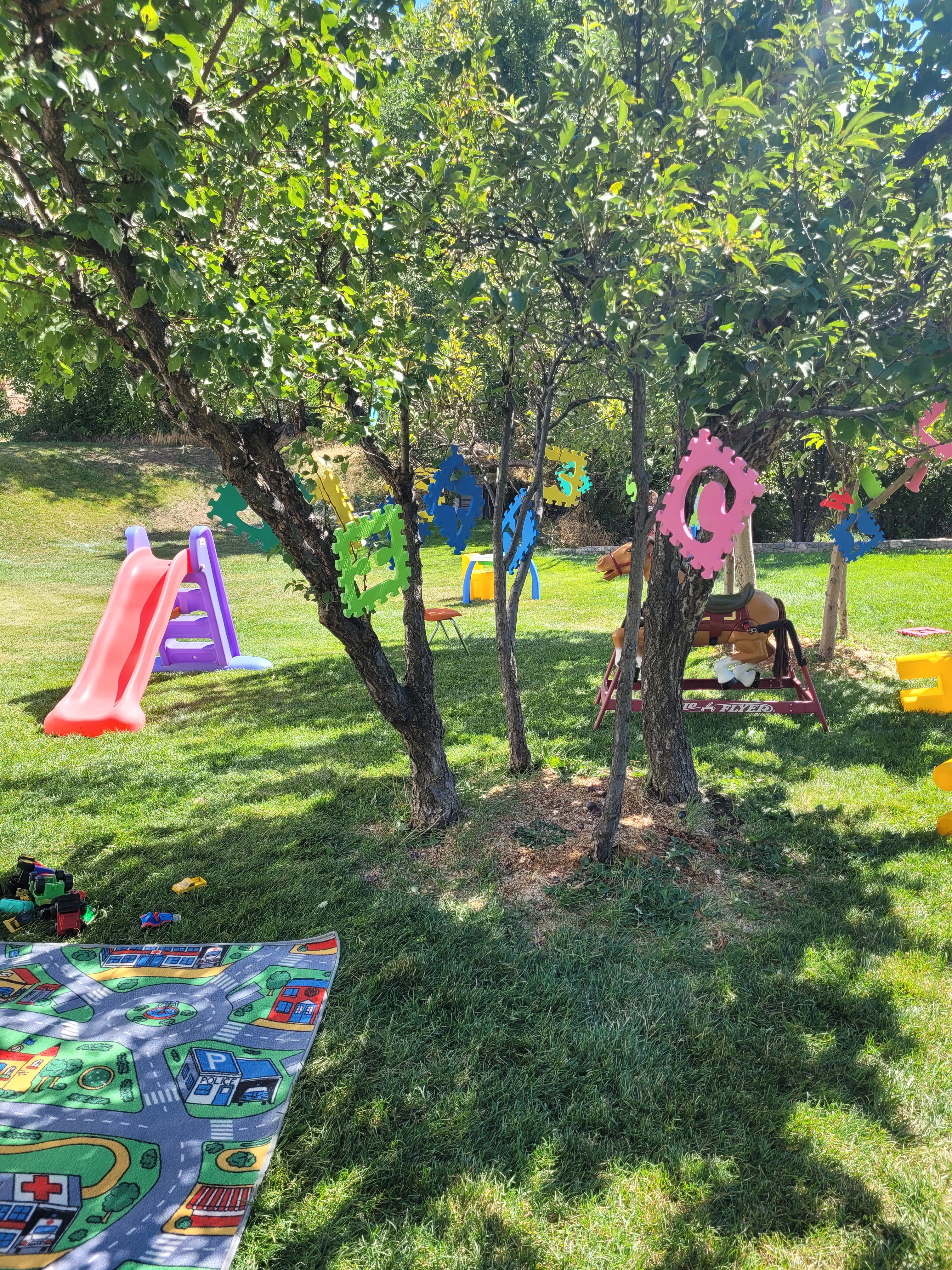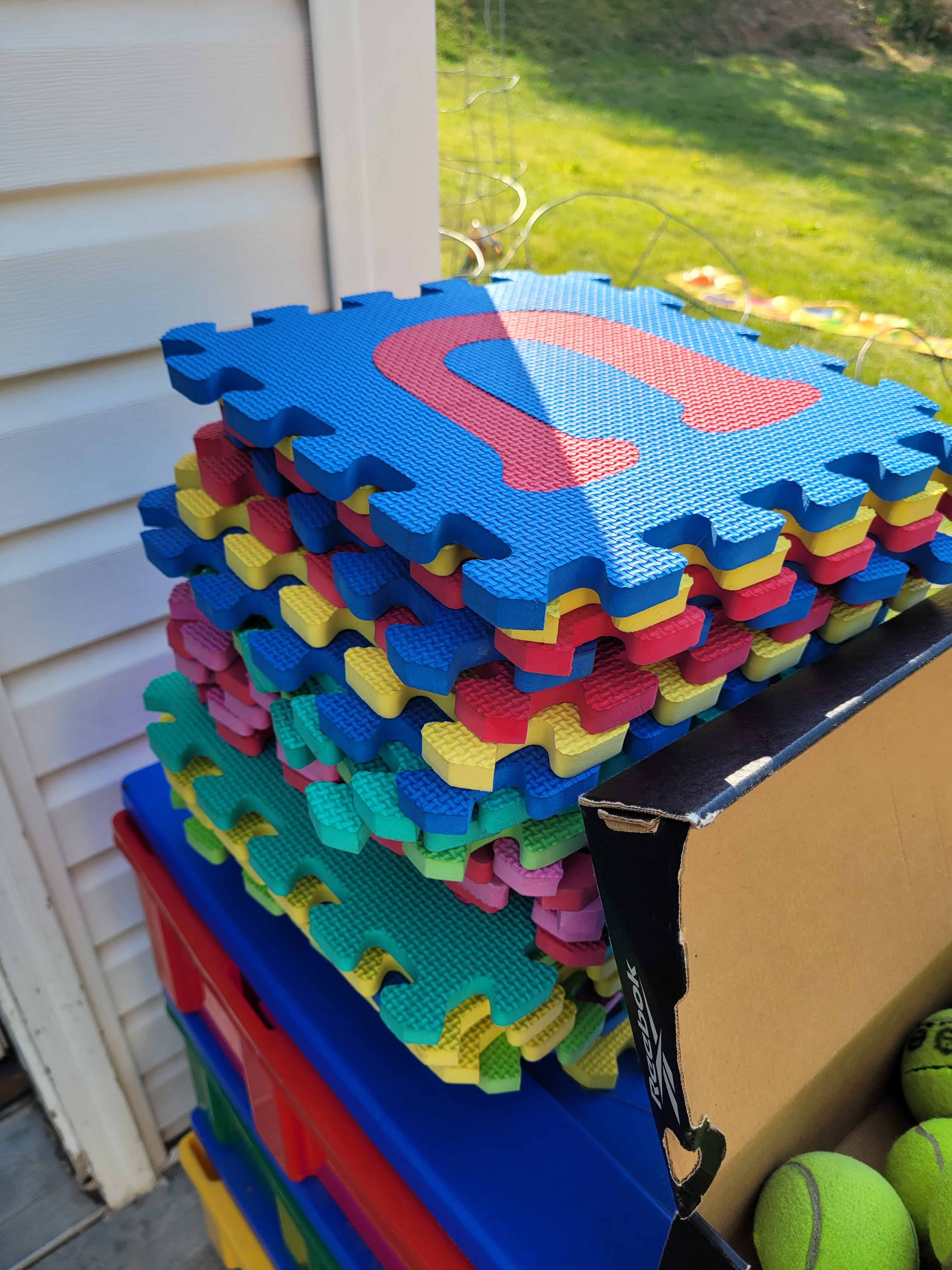 The fist things are these cut up pool noodles I’ve had for years. My intent was to let the children use them as swords since they are safer then sticks. But for some reason, I never got around to setting them out. And by some reason, I mean that I couldn’t bring myself to allow that kind of play, so they sat in my closet until now. Of course the majority of the use is fighting, but there are a few things that surprised me. They were used to make a campfire. They were used to measure the slide. I can’t wait to see what other ideas will come.