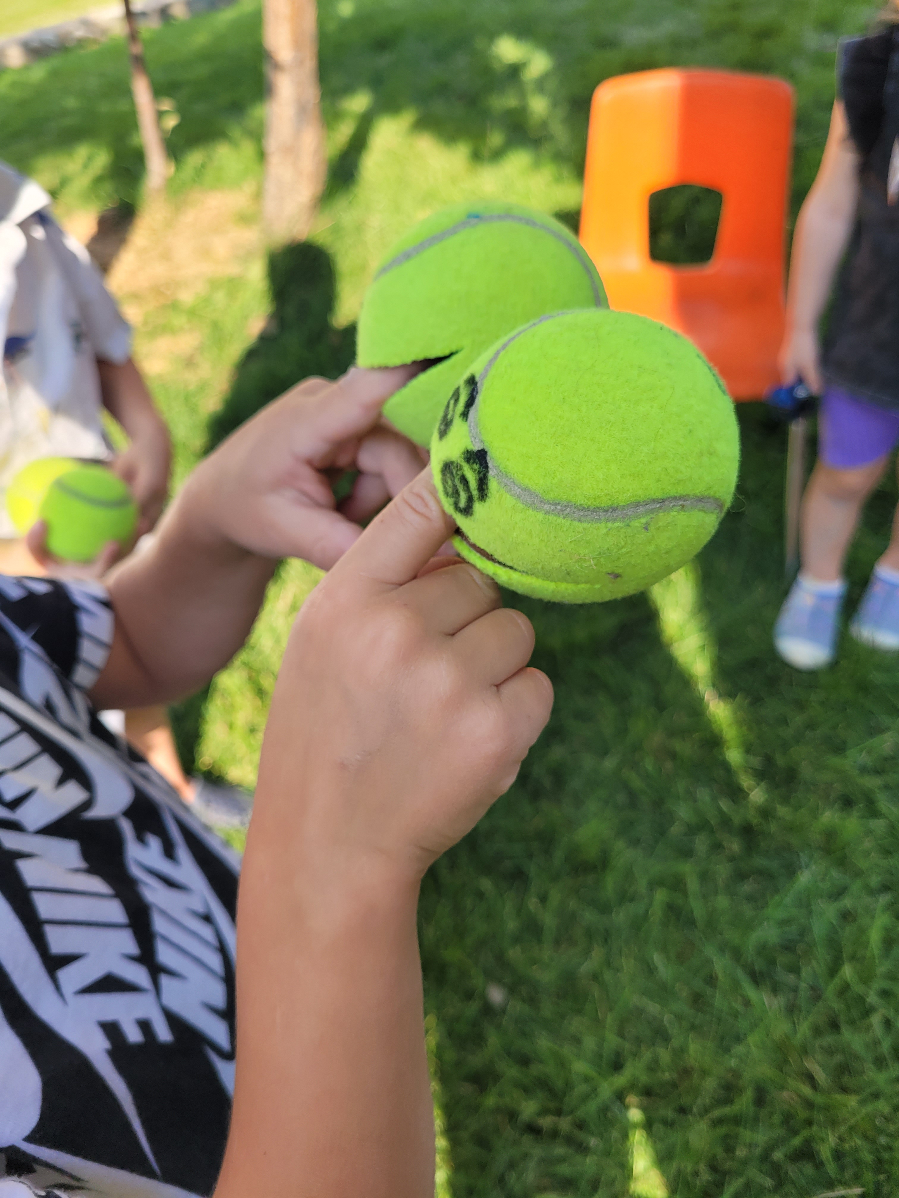 Someone gave me these tennis balls years ago. They have a face drawn on them and a mouth cut out. They were used as a singing aide. I never used them for that, mainly because I had put them away and forgot about them. But out they came this year. The first, and expected, thing was sticking fingers in them. How fun is that! Then it was discovered they could be an ice cream cone when put on a sports cones. They also could eat the grass and whatever is in the sensory table. They were even a home to a few rolly pollies we found.