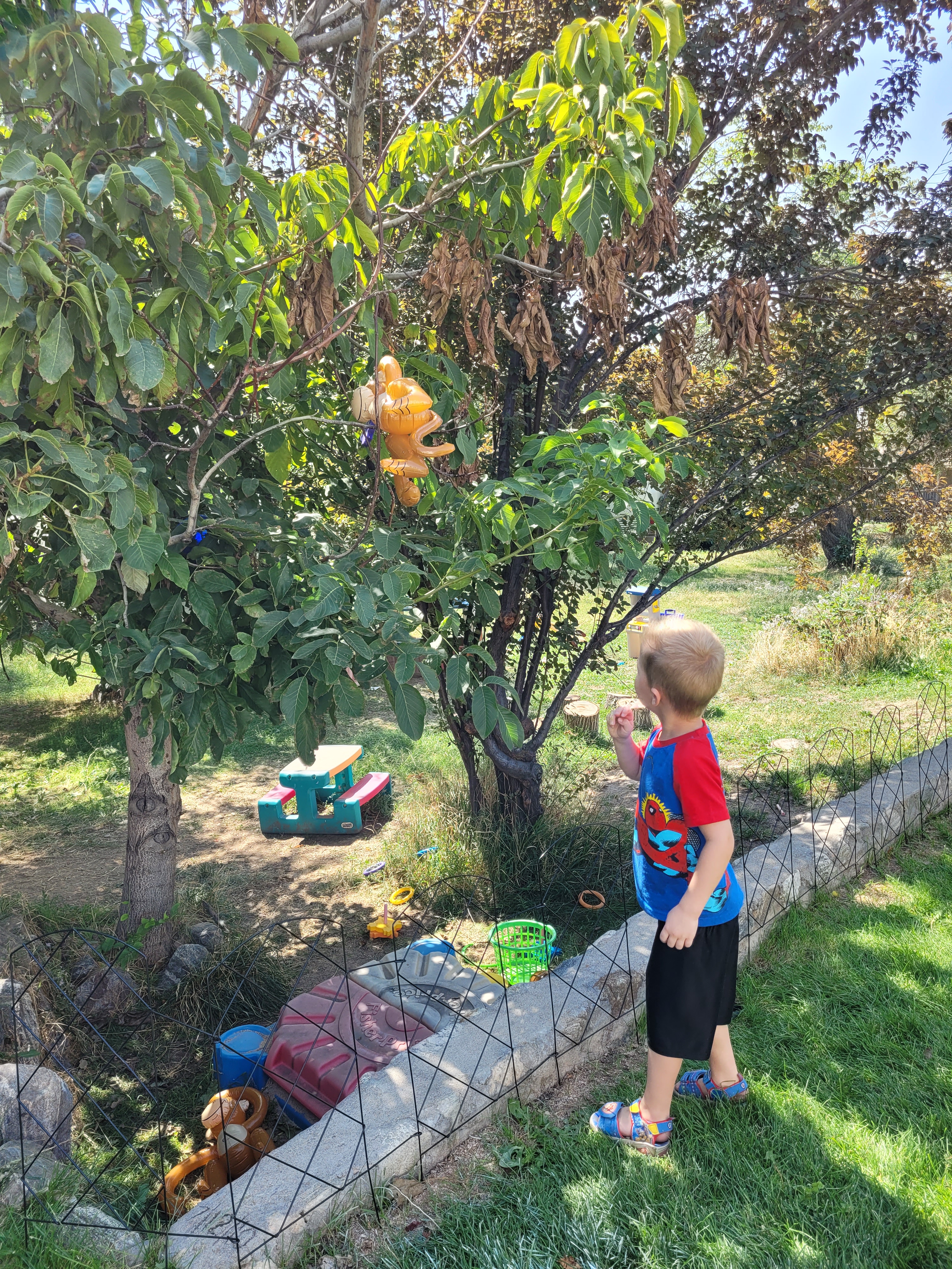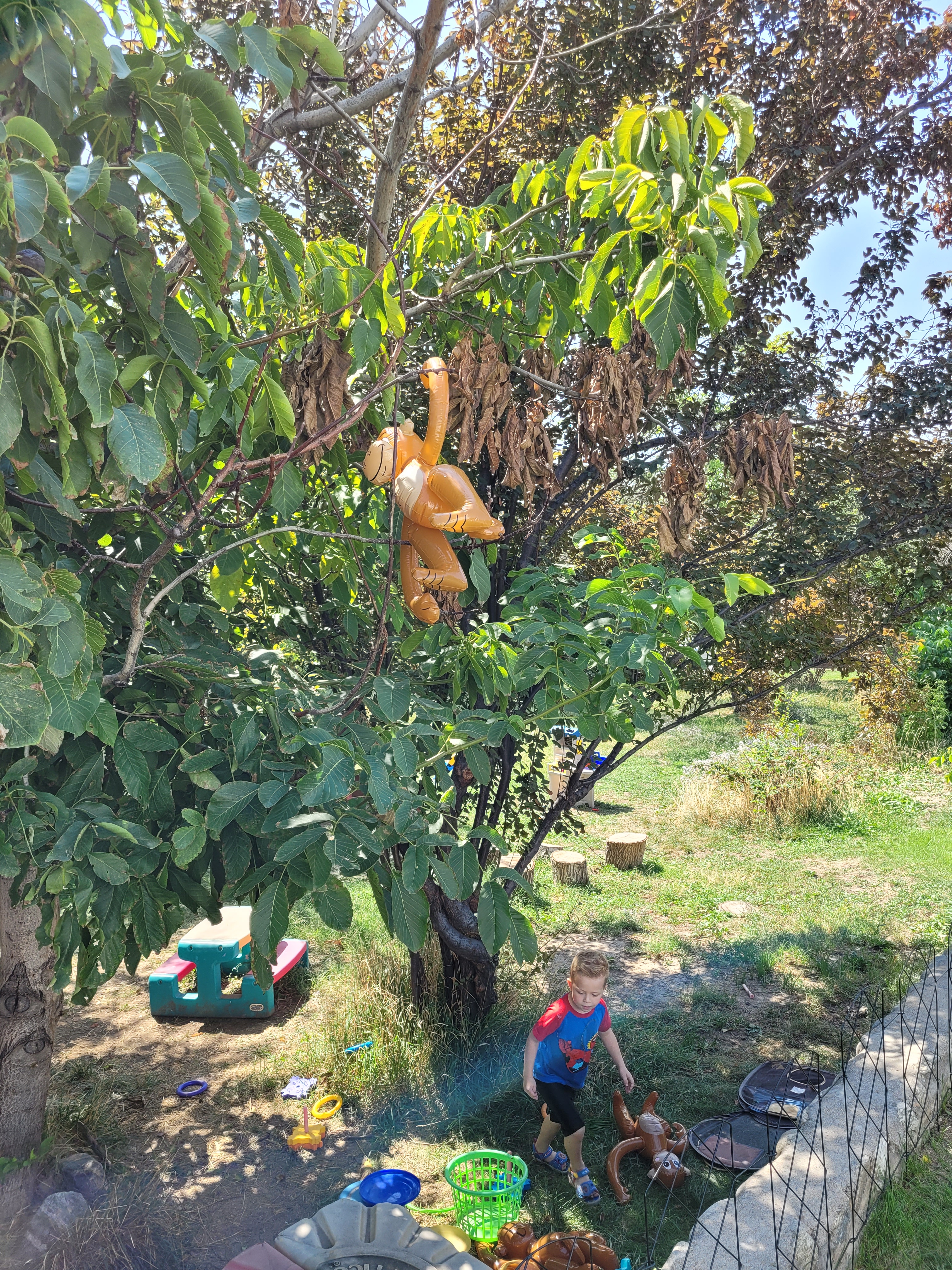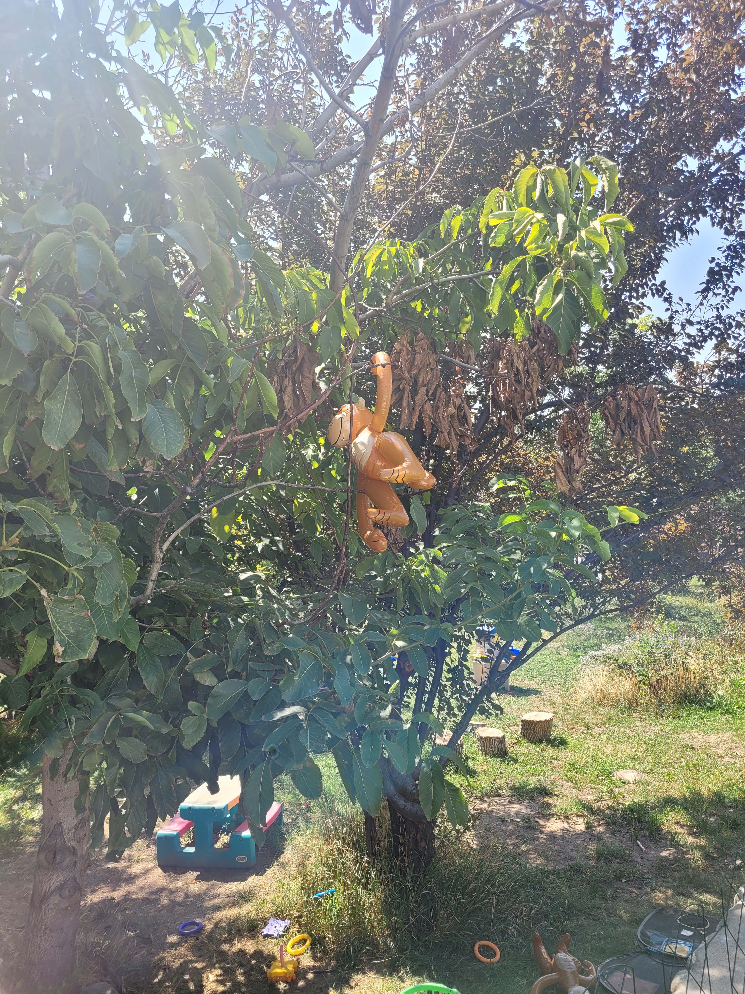 These inflatable monkeys were a big hit. Whether hanging out in the parachute (another thing I gave up control of and let the students use it however they want) or in the trees (where some great planning and strategizing took place to get them down).